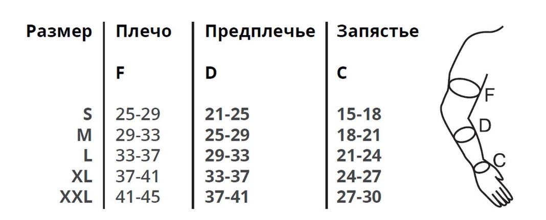 - необходимо измерить окружность на уровне запястья (C), окружность самой широкой части предплечья перед локтем (D), окружность плеча на 3 см ниже подмышечной впадины (F);