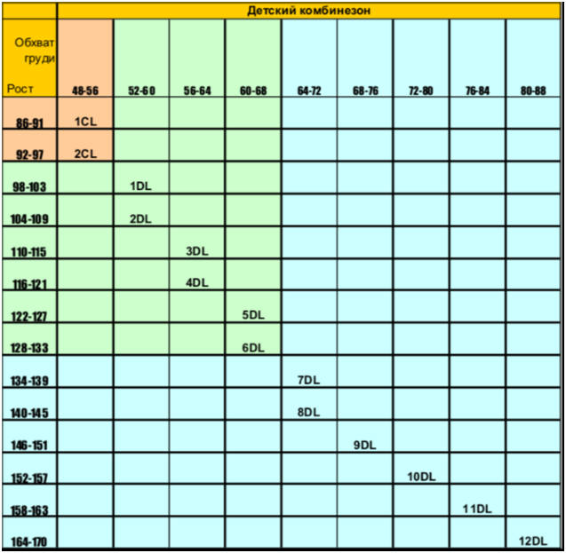Таблица подбора размера костюма Лайт: